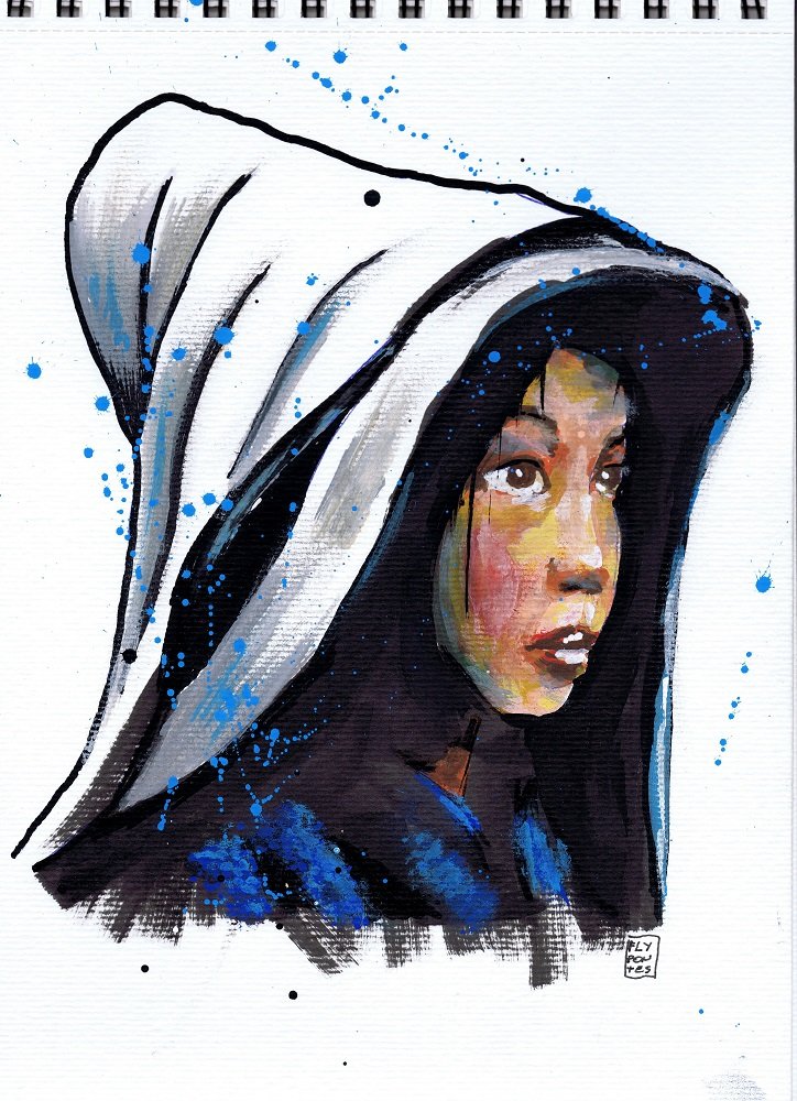 Este retrato é um exercício de reinterpretação, onde transpôs a poderosa e icónica fotografia ‘Boy, High Himalaya‘ de Eric Valli para o meu estilo de ilustração. O foco está no olhar da figura, procurando manter a profundidade e o detalhe que a imagem original transmite, utilizando a saturação única dos marcadores.