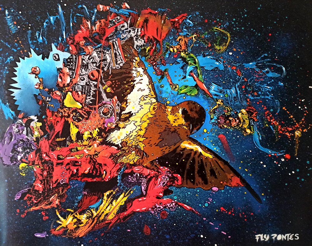 Os salpicos de cor (vermelho e azul) espalhados pela peça reforçam o dinamismo. É a escolha perfeita para um espaço que procure uma obra que combine arte urbana, precisão de ilustração e um toque de ficção científica.