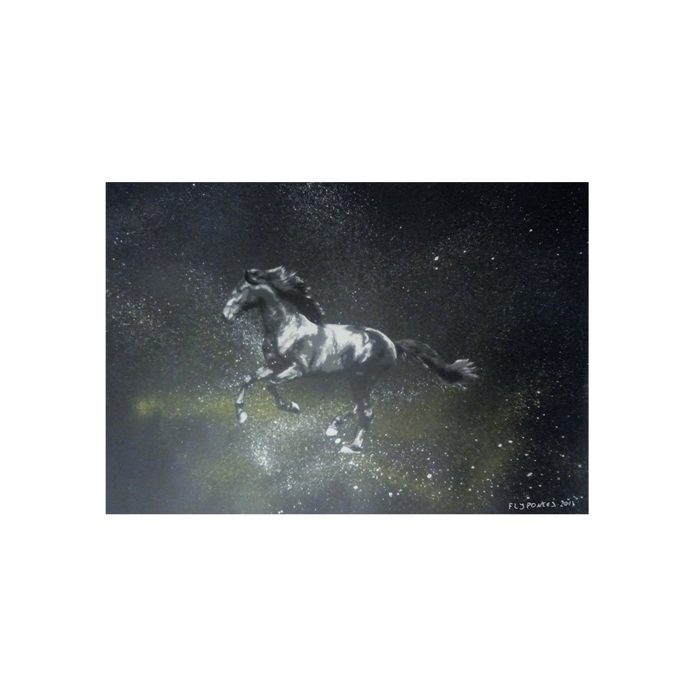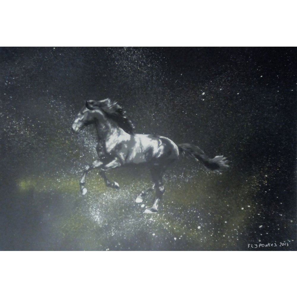 Sinta a força e o movimento capturados numa obra que celebra a liberdade. A tela "Cavalo Cinzento" é um estudo sobre a energia cinética, onde a precisão do stencil define a anatomia do animal, enquanto a técnica explosiva do spray liberta a sua essência. Nesta composição, o cavalo surge em pleno galope sobre um fundo preto profundo, que ganha vida com esfumados de branco e amarelo. O grande destaque técnico é o uso da needle cap, que permitiu ao artista Fly Pontes lançar jactos e gotas de tinta directamente dos cascos do animal, criando um rasto de velocidade que simula a poeira e a energia do impacto. O resultado é um contraste dramático, como um flash de luz na escuridão. Gostaria de ter uma peça com esta energia no seu espaço? Embora esta tela original já tenha encontrado o seu dono, o conceito de movimento e a técnica de galope podem ser adaptados ao seu projecto pessoal. Pode solicitar uma nova pintura com o mesmo tema, ajustando as cores e as dimensões às suas necessidades. Entre em contacto comigo para discutirmos a criação da sua tela única. DETALHES DO PRODUTO